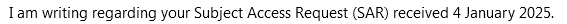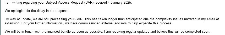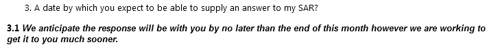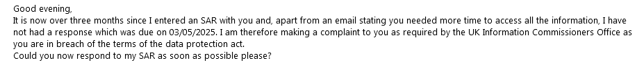 The response did say, however, that the reply to my SAR should be with me by no later than three months after it had been received, i.e either by 03/04/2025 using the date they said the SAR had been received, or 03/05/2025 using the date they actually received it.