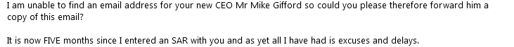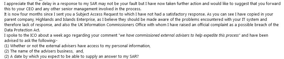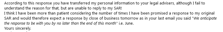 Having not received any response to my SAR request, I queried the delay and received a response from the current HR co-ordinator which I have abbreviated:-