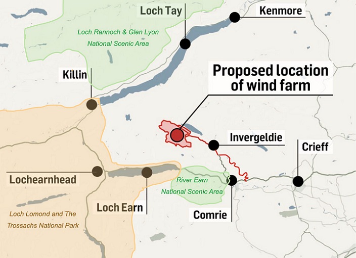 - the turbines would despoil views both from within and across the River Earn National Scenic Area, between Comrie and St Fillans, and the Loch Rannoch & Glen Lyon National National Scenic Area, on the north side of Loch Tay