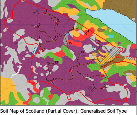 - the wind farm would be sited on peatland of varying depths on the western portion of Invergeldie Estate; a large area of deep peat would be dug up and degraded to create turbine bases and access tracks (but Oxygen Conservation are applying for a public grant for peatland restoration on the east side of Invergeldie Estate)
