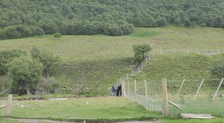 This is the same conservation failure as the woodland planting in the Glen Banchor part of the estate where the public have effectively paid for sections of the River Calder to be fenced while all around high deer numbers wreak destruction. Often the best grazing is on river floodplains, because they are regularly fertilised by floods (as in the left foreground) and although these are the areas where “riverwoods” would be least likely to develop naturally they have now been planted (trees visible on right behind fence).-