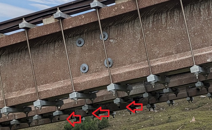 These brackets, that are designed to make this railway safe and simple test that would confirm that they functioning as designed, would be to tap them lightly with a piece of metal like a large door key to see if they have a consistent ring. Given the rods are all the same length and are “suposedly” tensioned to the same torque (winter and summer) they should all produce the same musical note.