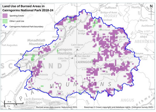 My colleague Euan Stevenson and I analysed the most recent satellite derived data from NatureScot that maps all discreet fires in CNP from late 2018 to early 2024. Almost 3000 fires are recorded, covering an area of 21 million square meters. By apportioning each 1 km square to either sporting or non-sporting ownership we found that 98% of all fires (and 92% by area) begin on sporting estate land, with the maximum number of fires in any km square a staggering 30 in only 5 years.