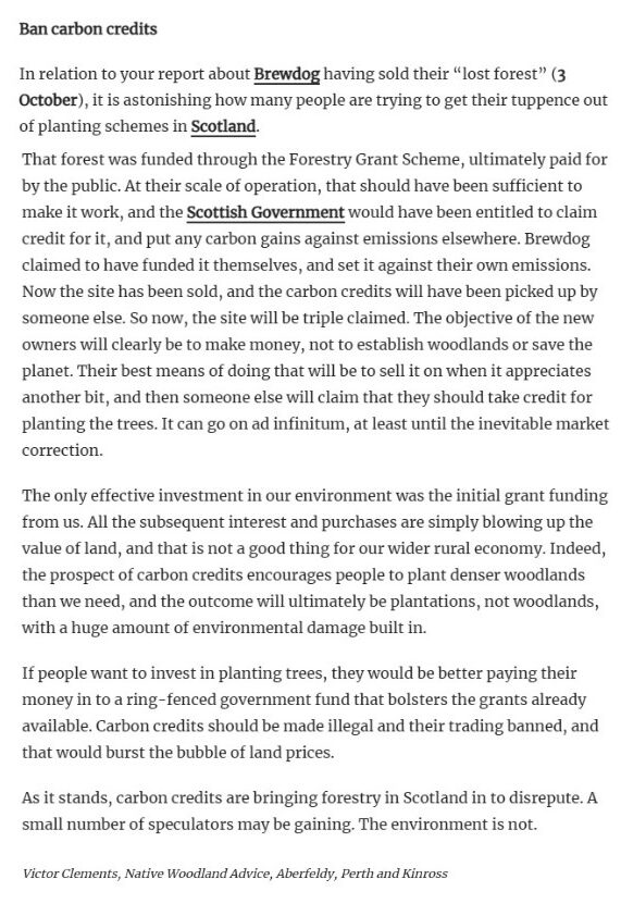 Its great that other people are now publicly criticising the carbon trading land racket but it takes considerable courage for someone working in native woodlands to call for carbon credits to be abolished. I am pleased therefore to re-publish this letter to the Scotsman from Victor Clements who comments regularly on this blog: