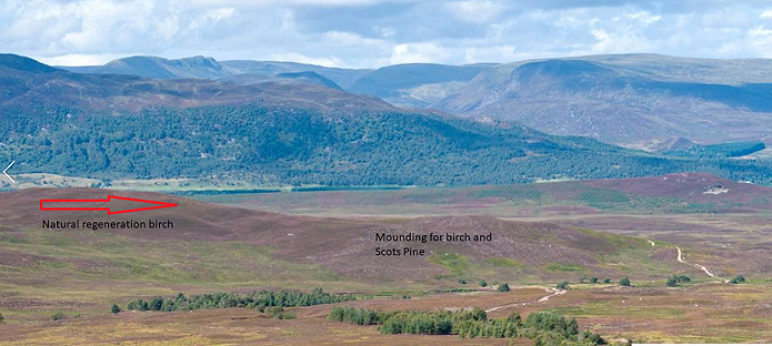 APIT originally want to plant Meall Dubh but after it was pointed out lots of birch was naturally regenerating there, APIT and their agents AKRE agreed to reserve a small area for natural regeneration. What Savills’ photo shows is how little it would have taken for that birch to join up with the native woodland plantations and extensive alder regeneration along the Allt Ghuibhais. That, however, would have attracted very little forestry grant which has paid for the mounding and planting of the ridge to the right. Savills’ brochure states while 47 ha of the estate has been reserved for natural regeneration 788 ha have been planted.