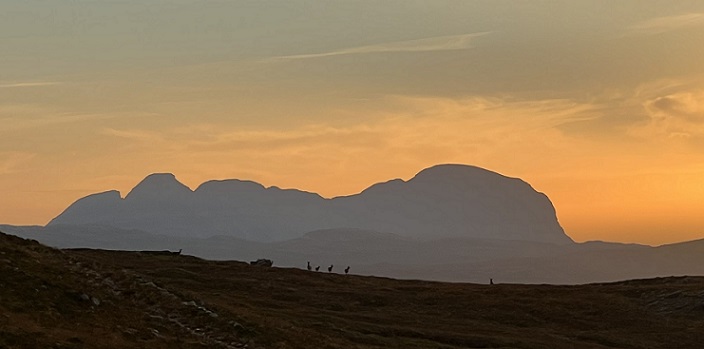 Sun going down on Cuinneag/Quinag, Assynt with red deer on near horizon. Photo credit Victor Clements
