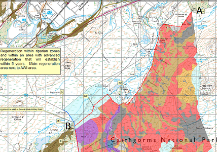 “The area identified for planting has a boundary of approximately 19.2km with its neighbours. The site will be protected by using a deer fence (2595m) along the boundary with Phonies Estate. With a stock fence (5265m) being used along the Ralia Estate boundary. The deer fence will not be marked with regards to Black Grouse as is the Lek is over 2km away from the fence on site. No fencing will occur along the wildland boundary, this will leave an open boundary of approximately 8720m. A stock