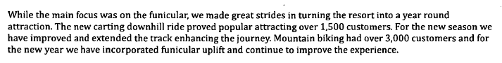 The profit and loss statement in the accounts shows that the new visitor attractions, such as carting and mountain biking, are make very little difference to CMSL’s overall financial position. Even if £85k had been raised from mountain biking it would still comprise only c5% of total income: