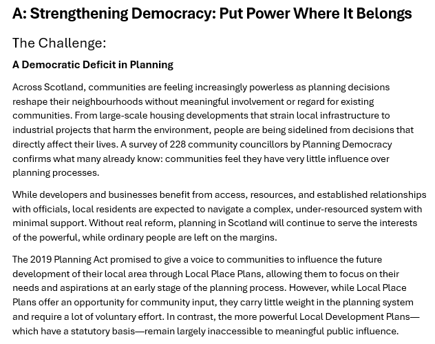 I commend the whole manifesto, it is only 22 pages in total, and avoids most of the planning jargon used by the Scottish Government and planning authorities which is so disempowering. Were its recommendations to be implemented in my view Flamingo Land could never have happened.