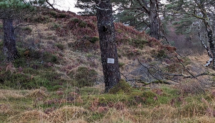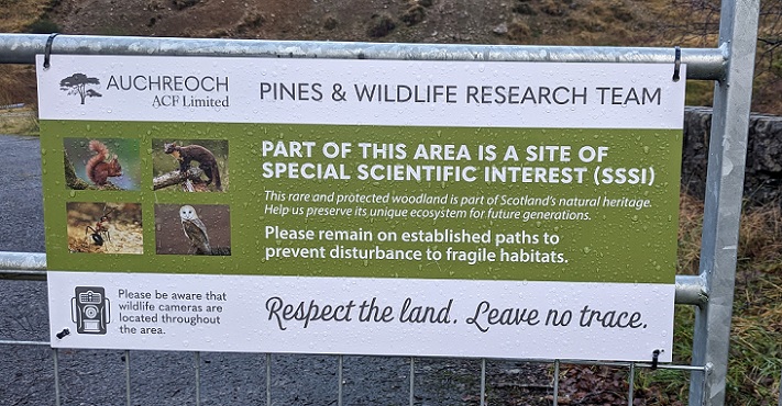 While walking through Coille Coire Chuilc, having ignored the exhortation from the Auchreoch Estate’s ” Pines and Wildlife Research Team” to “remain on established paths”, we spotted this sign from about 50m away. Being inquisitive people, we diverted from our route to have a closer look.