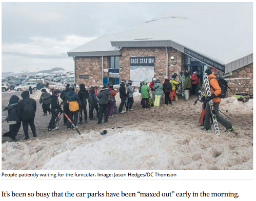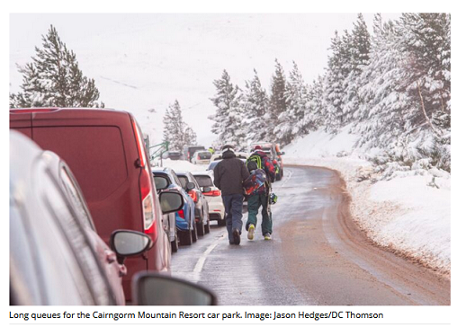 Second, these winter capacity problems caused by reliance on the funicular have been made even worse by HIE reducing the number of parking spaces at Cairn Gorm – hence the queues of cars – without providing any alternative.