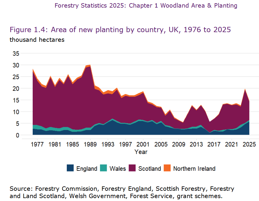 Not especially ambitious for an emergency, but perhaps overly ambitious for our antiquated grant system which has, except for the year 2023/24, delivered less than 10,000 ha of new woodland per annum in the past two decade: