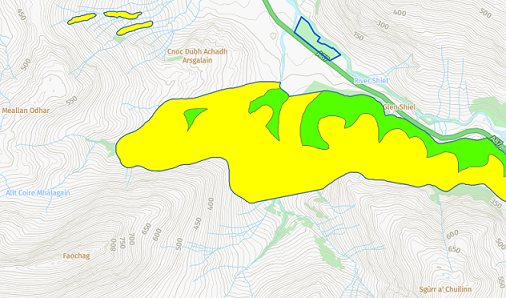 The plantation extends from Coire Mhalagain, around the lower part of the north east ridge of Faochag and then east into Glen Shiel and was planted under the Woodland Grant Scheme 2 1991-94. This was a product of the successful campaign by the RSPB, Nature Conservancy and others in the 1980s against the afforestation of the Flow Country. The forestry tax breaks which had driven planting on this important habitat were abolished and replaced in 1988 by the ostensibly more environmentally sensitive Woodland Grant Schemes. There were three versions of the schemes (WGS1, WGS2 & WGS3), which lasted until 2004 and provided direct subsidies to landowners to plant and manage woodland. They prompted a wave of new native tree planting across Scotland, including Glen Shiel, Glen Affric an Kintail..