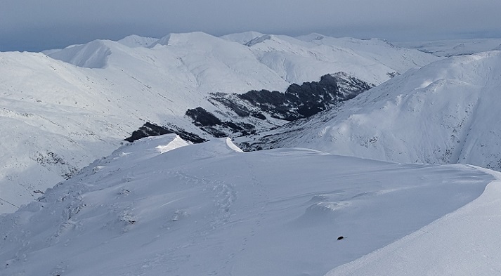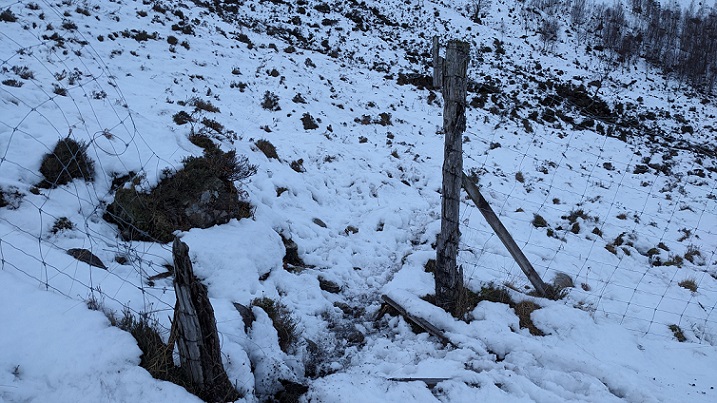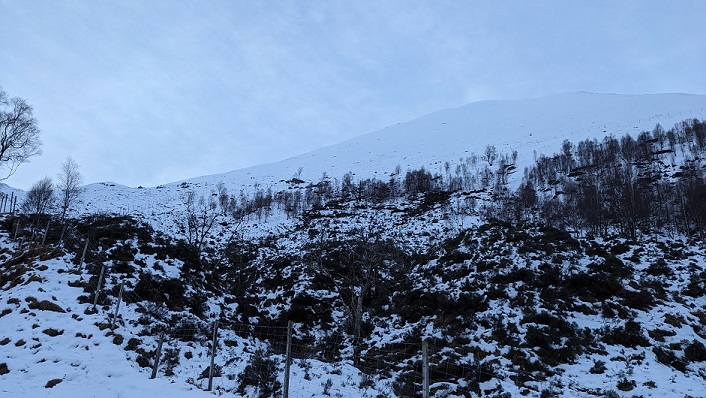In the snow, there was no obvious way through the Faochag enclosure to its north east ridge so I decided to walk around it. Even from a distance, there were far fewer deciduous trees than one might expect in a planted enclosure of this size. When I reached the fence I spotted several red deer walking through the trees in the middle distance before losing sight of them. Deer are very hard to spot in woodland when stationary and I could not spot them in this photo afterwards.