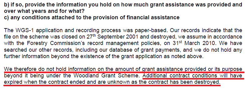 Scottish Forestry’s response goes on to explain why they did not hold the information – all the documentation about this WGS scheme has been destroyed: