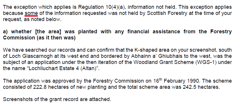 As I found out accidentally afterwards, the Scottish Government published this FOI response nine months later (see here). I have been meaning to submit another FOI asking Scottish Forestry if they hold this information about ANY of the WGS schemes 1998-2004 – I suspect not and that the Forestry Commission destroyed all their records.