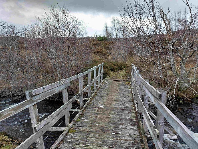 Footbridge near the Drochaid Tigh na Mile ford. Drochaid means bridge and suggests that historically there must have been a bridge near here as part of  Wade’s Road. This bridge is shown on some maps. Photo credit CNPA.