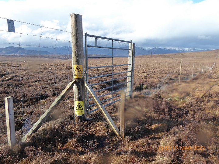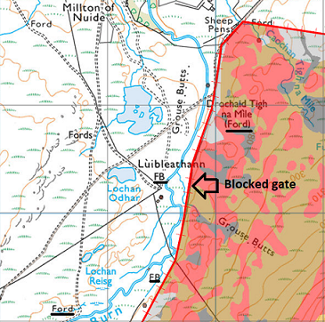 The approved map shows three gates, two along the northern boundary and a third, an existing gate, where Wade’s Rd crosses from Far Ralia to the Phoines estate. Two further gates were not marked on the approved map: the one opposite the Drochaid na Mile and another at the very southern tip of Far Ralia giving access to the Phoines Estate