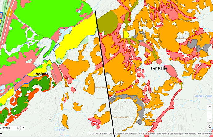 Woodland at Phoines and Far Ralia. The yellow shows the 1999 WGS just south of the gate on the Old Military Rd. The orange and red below that the Phoines Estate Forestry Grants Schemes approved in 2025. I have added the black line to show the deer fence.