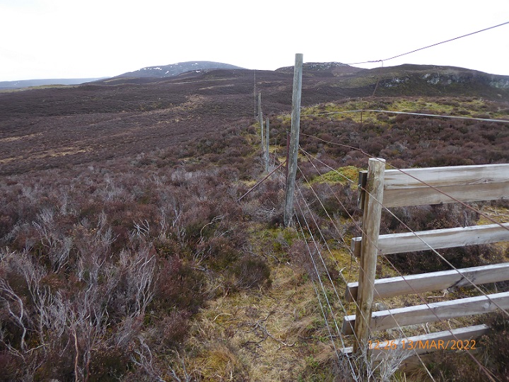 Beyond the WGS birchwood and natural regeneration area, the deer fence continues all the way to the southern tip of Far Ralia, a distance of over 4 km.  Four years ago at this point (photo left) there was was a stock fence on the Phoines side of the deer fence, perhaps intended to keep sheep out of the birchwood, together with a farm gate through it but no way of getting to it from Far Ralia.
