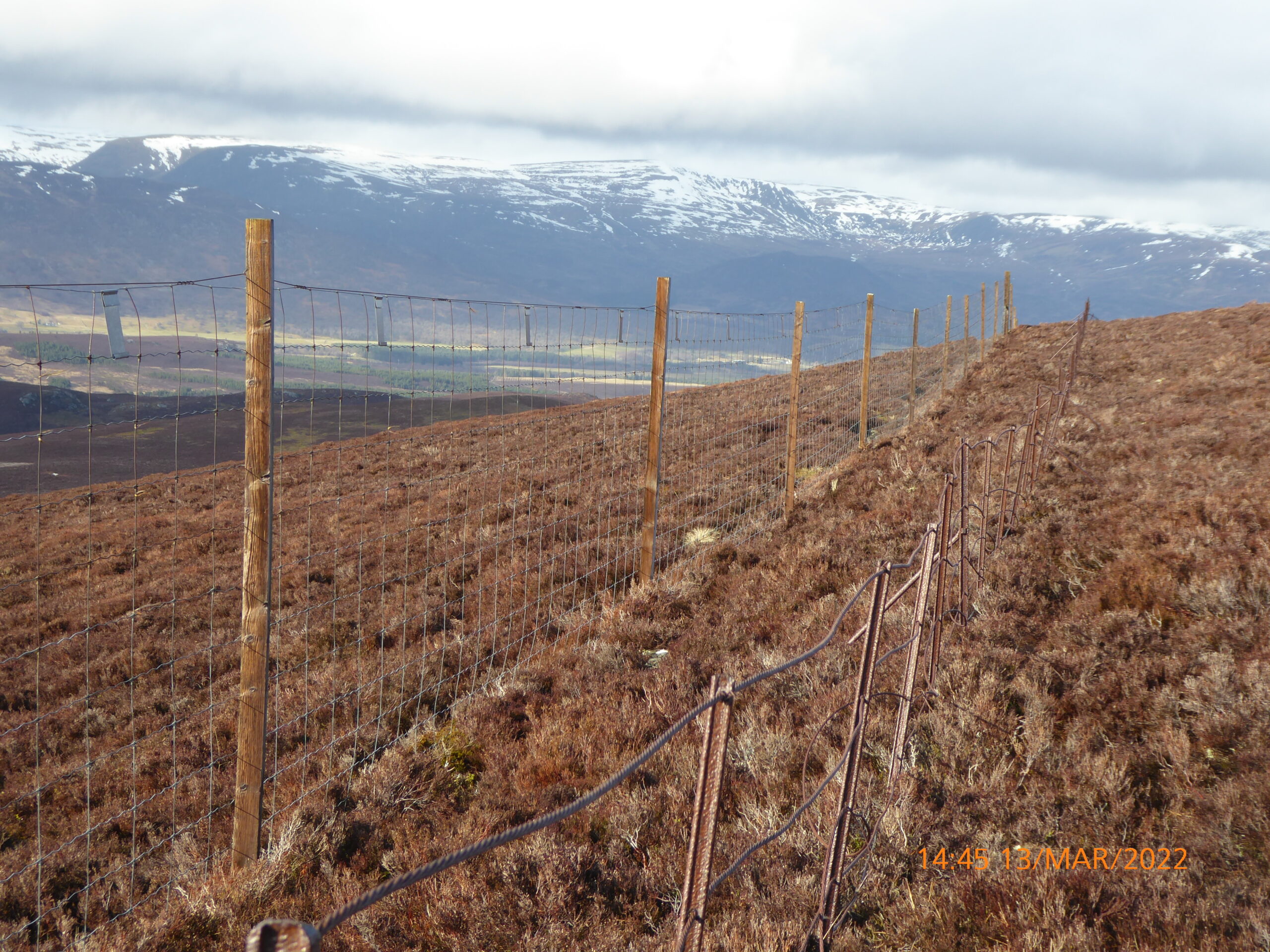 The deer fence on the western side of Garbh-mheall Mor with Strathspey below.  The upper section of this deer fence had been erected prior to the Far Ralia woodland creation scheme and did not form part of the grant application.  Note the old stock fence, also redundant, and the small bits of metal, a token attempt to mark the fence so birds don’t fly into it.