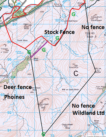 Scottish Forestry’s contract for the woodland planting at Far Ralia contains a detailed Forestry Grant Options map (extract above). This shows the fencing proposals in more detail but is too big to reproduce here.  The essence of the final plan, however, was quite simple (left): there would be no fencing on the east and south-east boundaries of the estate; a deer fence would run along the western boundary with the Phoines estate; and a stock fence would run along the northern boundary.