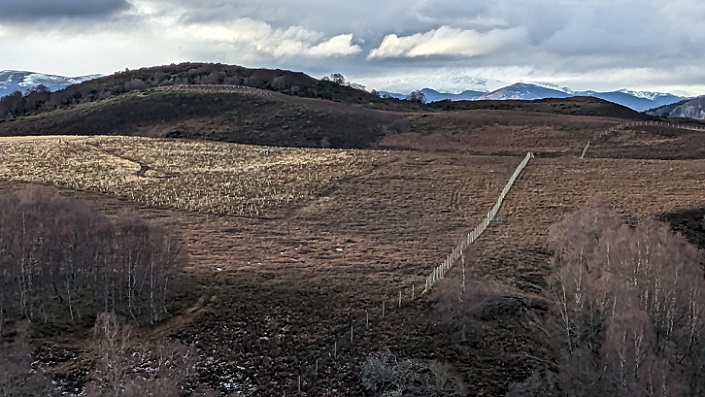 The woodland visible around the top of Creag Bheag was funded under the Woodland Grant Scheme 3 in 1999.  Twenty years later the Balavil Estate engaged Trees for Life Woodland Services to design a new area of native woodland on the estate, around Creag Bhalg.  This is about 3 km north east of Kingussie, was funded by Scottish Forestry in 2021 and involved the erection of new deer fences, including one along Balavil’s boundary with Pitmain.