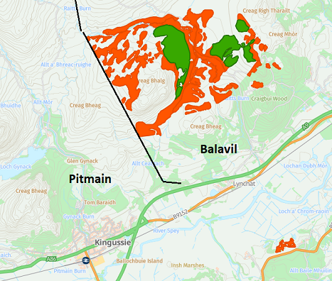 The Creag Bhalg native woodland woodland. Red = Birch and Mixed Broadleaf; Green = Scots Pine. I have added the black line to show the approximate boundary between the Pitmain and Balavil estates. Map credit Scottish Forestry viewer.